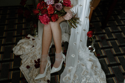 It was really important to me that we honor Alexis and her style through a very luxe dress and lots of accessories. The lead florist and I also knew we wanted the florals to be the star of any “decoration” we might use. What better flower to flood these images than roses for our "Alexis Rose?"